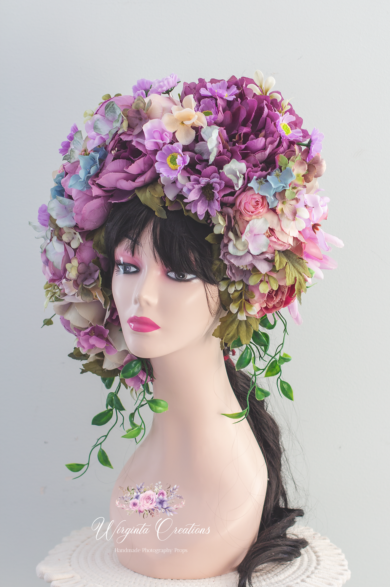 Enhance your photography portfolio with our beautiful, large adult or older children's artificial flower crown. This headpiece, created for professional photographers, brings a touch of luxury and elegance to any photo shoot. It’s also perfect for themed occasions, adding an extraordinary flair to your events.