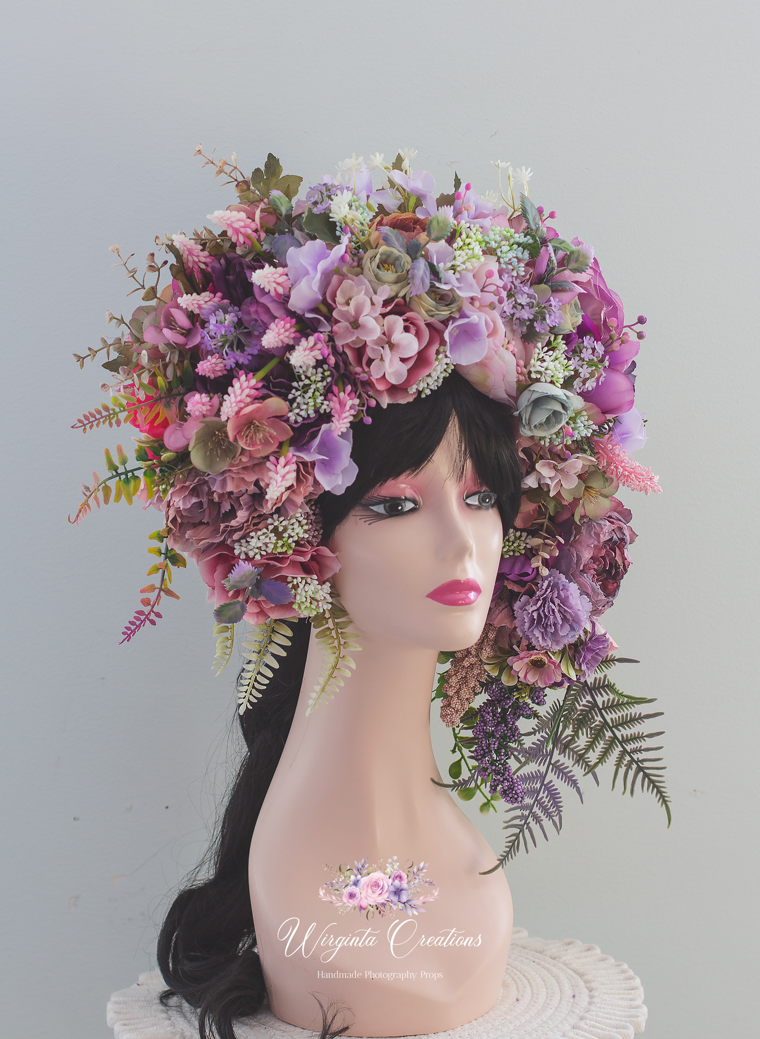 Large Flower Headpiece - Cascading Style Photography Crown - Purple, Lilac, Mauve - Maternity Photoshoot - Luxury Flower Headband