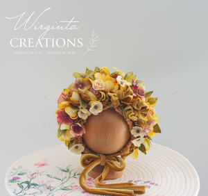 Flower Bonnet for Newborns (0-3 Months) - Photography Headpiece - Mustard Colour - Photo Prop